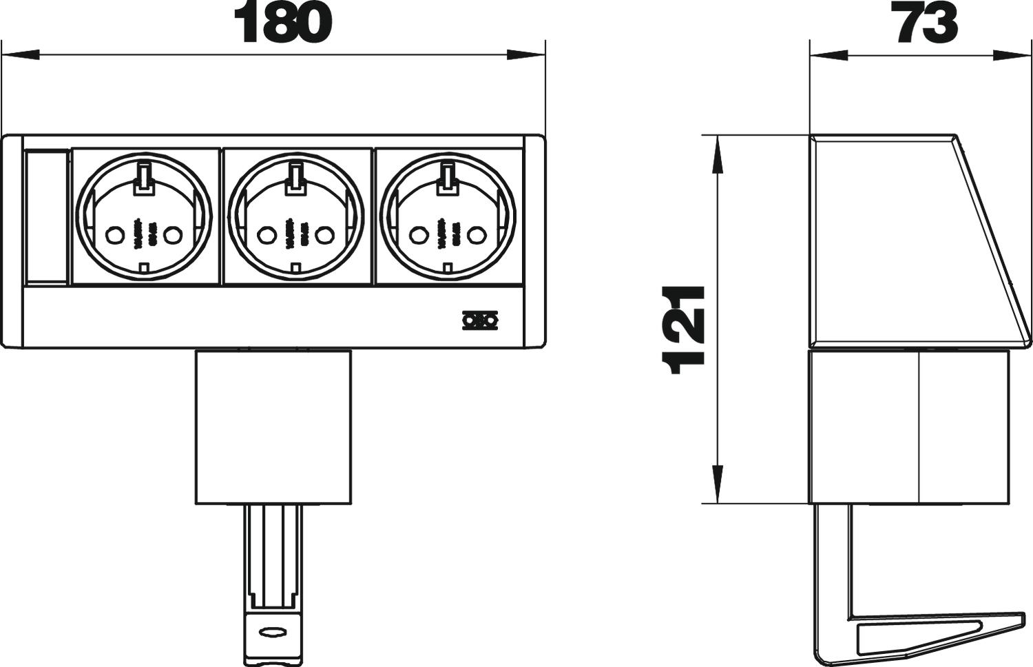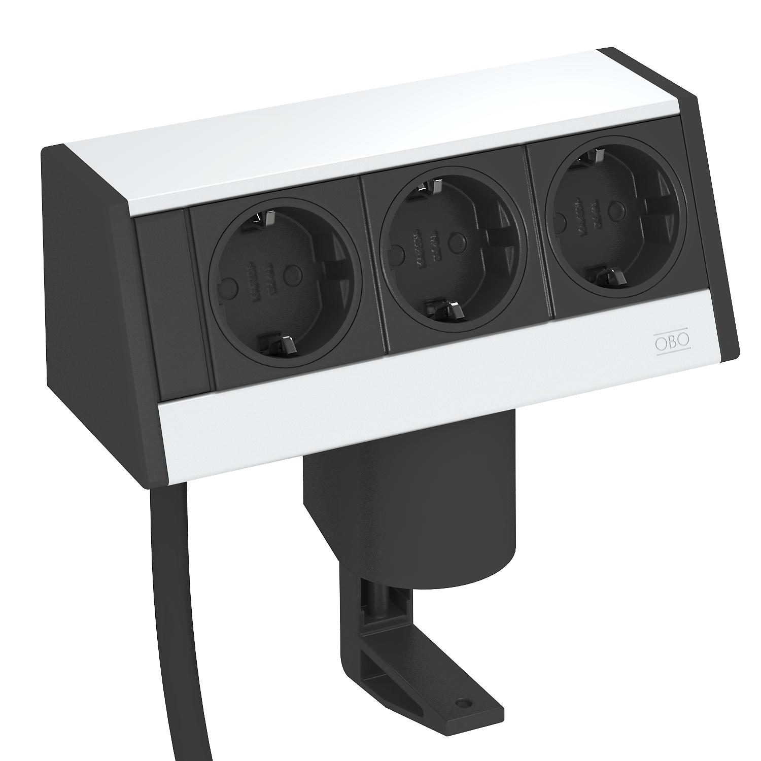 Настільна коробка зі з’єднувальним кабелем, кабельним виходом у нижній частині профілю з кріпильною скобою для стільниці товщиною від 8 до 40 мм.