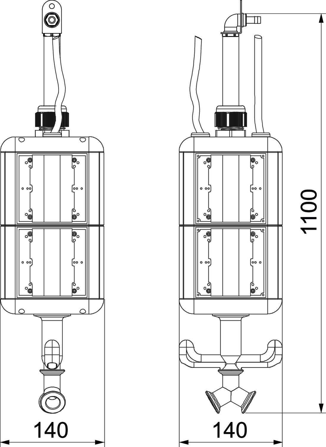 Порожній корпус із трубою 1 м 1/2” і з’єднанням для шланга стисненого повітря 13 x 3,5 мм і 2-ходовим розподільником 1/2”. З петлею для підвішування та гачком-ручкою, для встановлення електрообладнання, із закритою перегородкою. Без накладок.