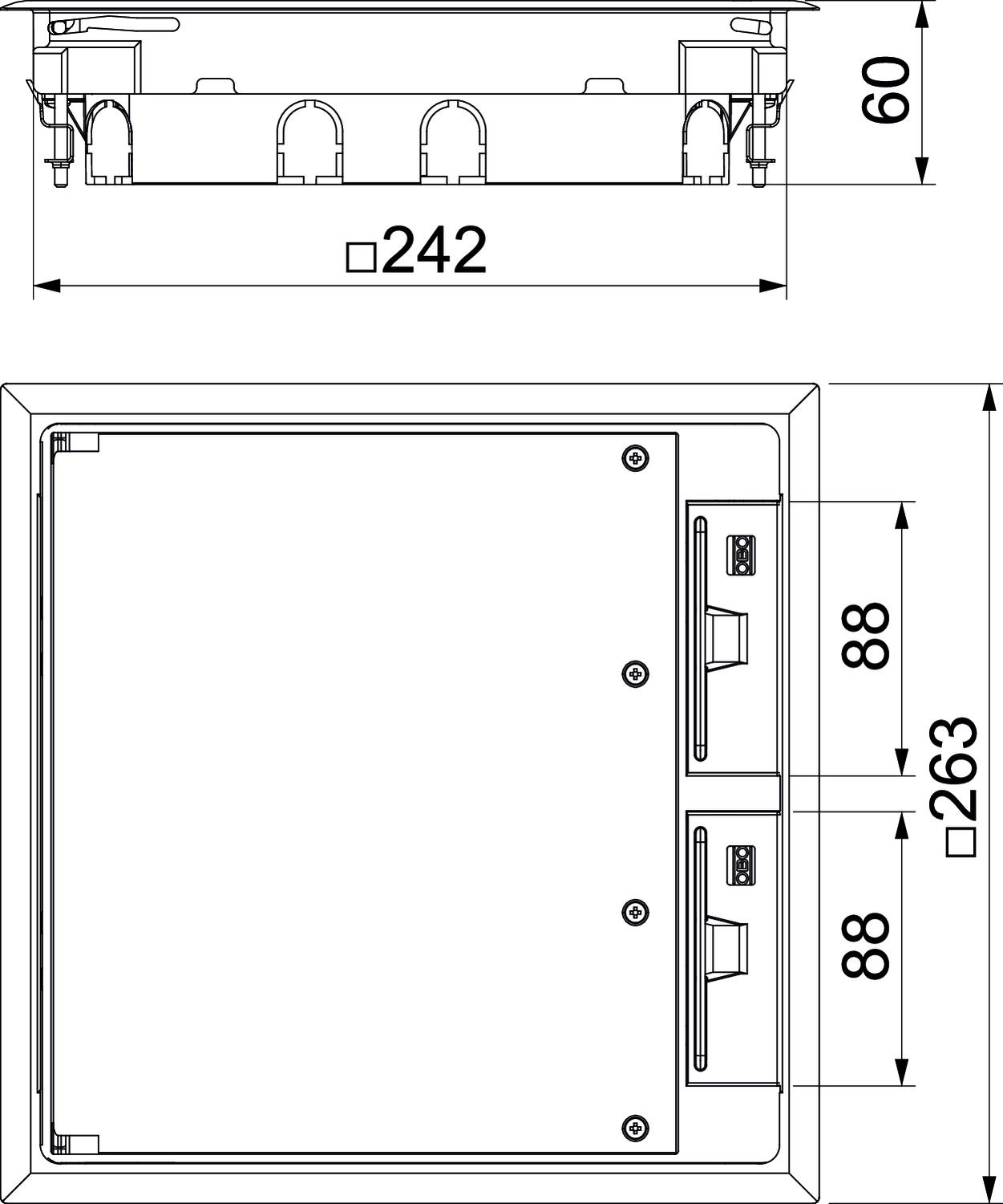 Розетковий люк GES9 з фіксованою будівельною висотою 55 мм для використання в системах монтажних каналів у сухих приміщеннях із сухими підлогами у внутрішніх приміщеннях. З двома монтажними корпусами для вертикального монтажу приладів Modul 45 і чотирма запобіжниками натягу. Для монтажу пристроїв Modul 45 потрібні дві монтажні рами.