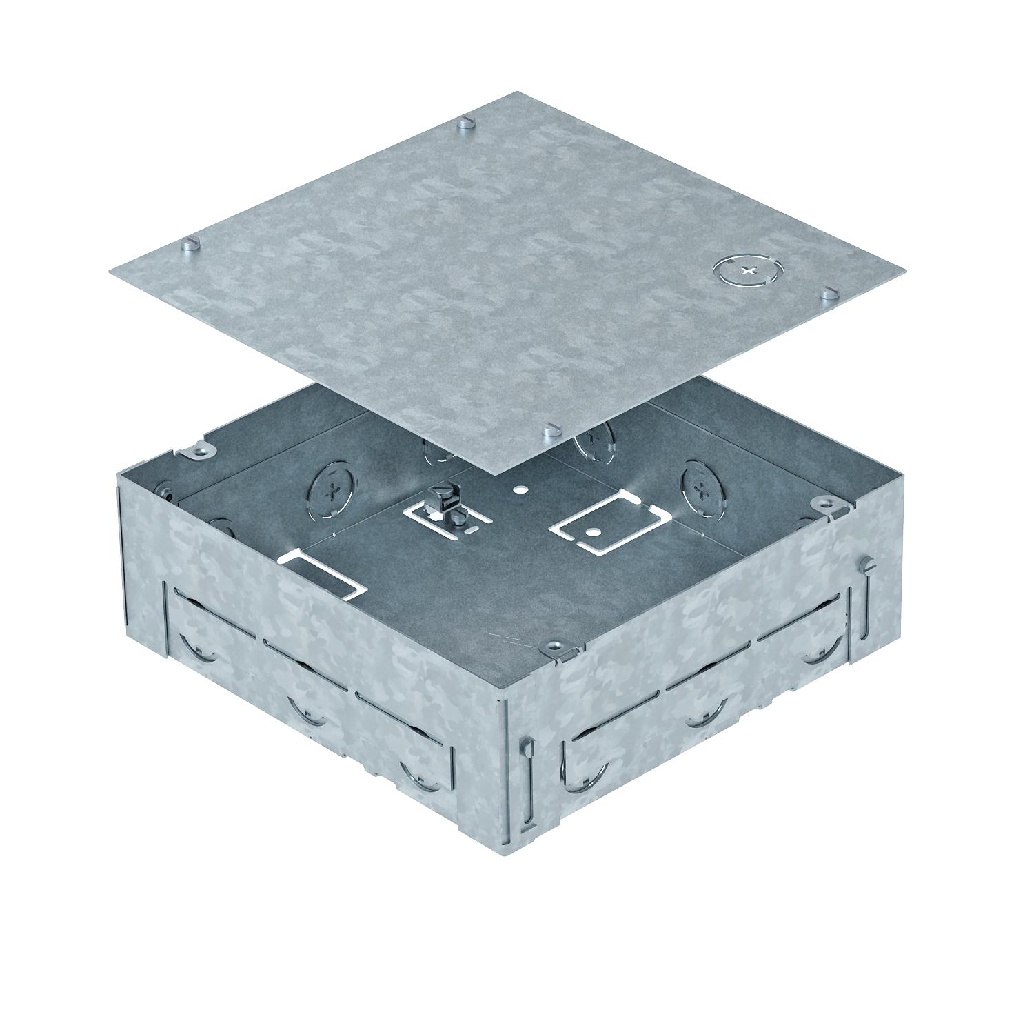 Квадратний інсталяційний корпус для одного сервісного блоку GES4-2 для монтування в стяжку підлоги для внутрішнього використання. З попередньо розміченими вставними отворами для трубопроводів (M25) з усіх чотирьох сторін.