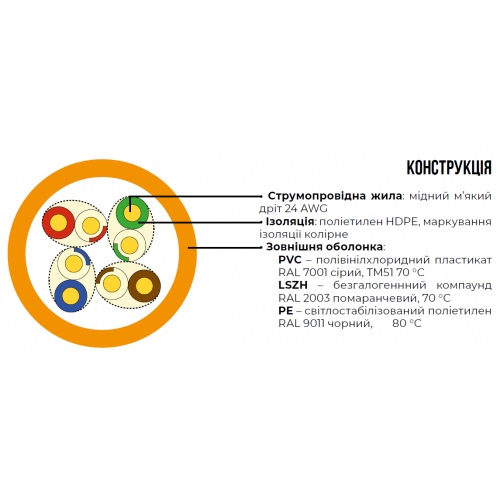 - Оболонка - полівінілхлоридний пластикат RAL 7001 сірий, TM51 70 °C