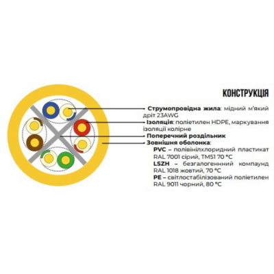 Призначений для структурованих кабельних мереж при одинокому прокладанні та прокладанні в пучках в середині будівель, споруд, апаратури , при експлуатації на частотах до 250 МГц, в умовах де потрібне низьке димовиділення;