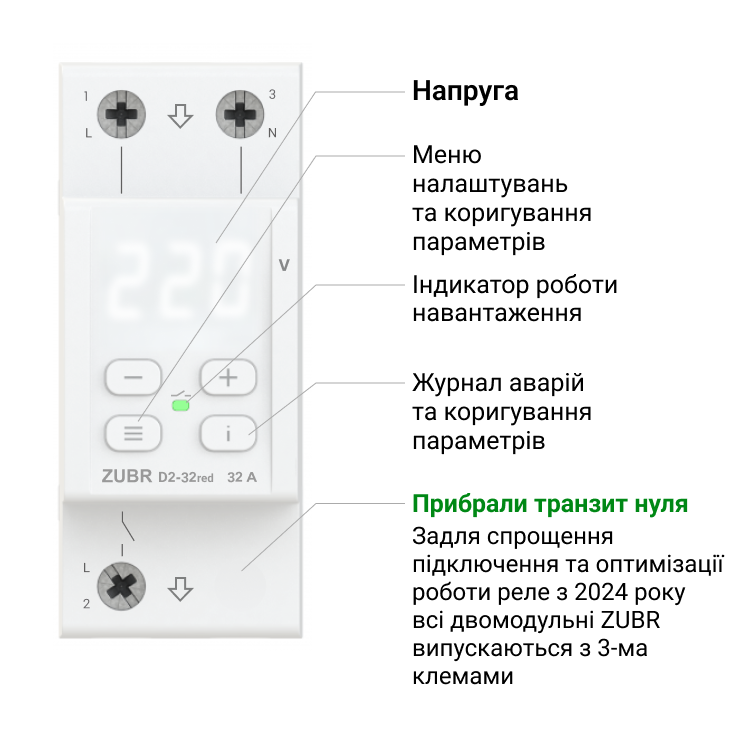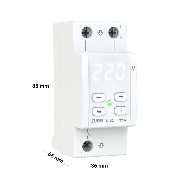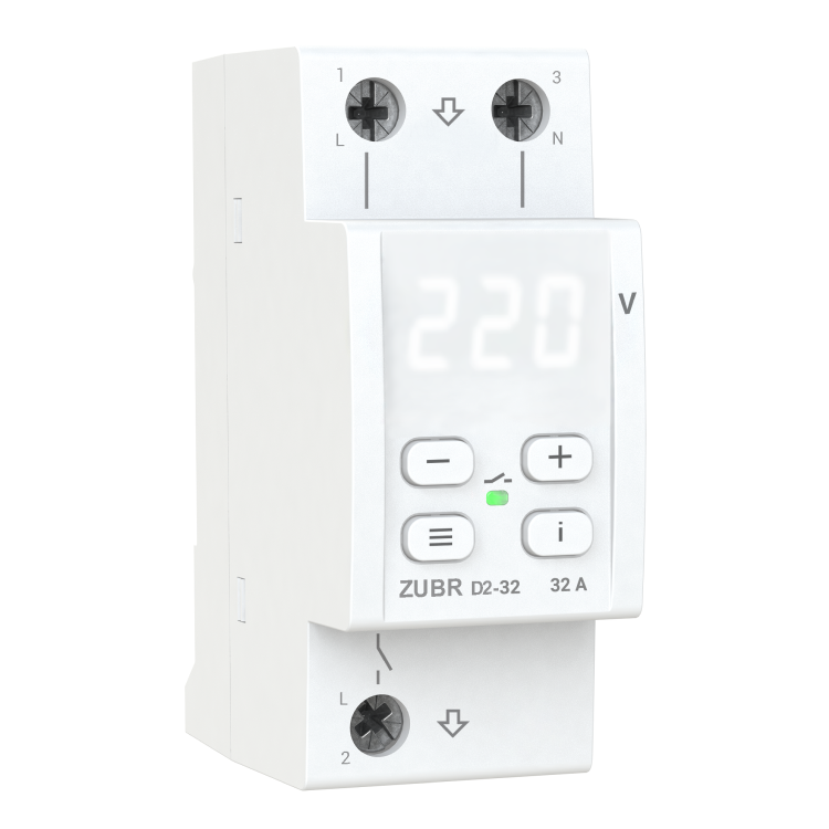 Реле напруги ZUBR D2 захищає від критичних стрибків високої та низької напруги, а також від обриву нуля. У випадку аварійної ситуації реле напруги відключає навантаження, а при нормалізації включає назад. Широкий функціонал реле напруги дозволяє оптимізувати кількість спрацьовувань завдяки індивідуальним налаштуванням під вашу мережу.