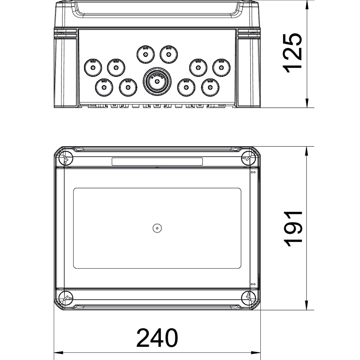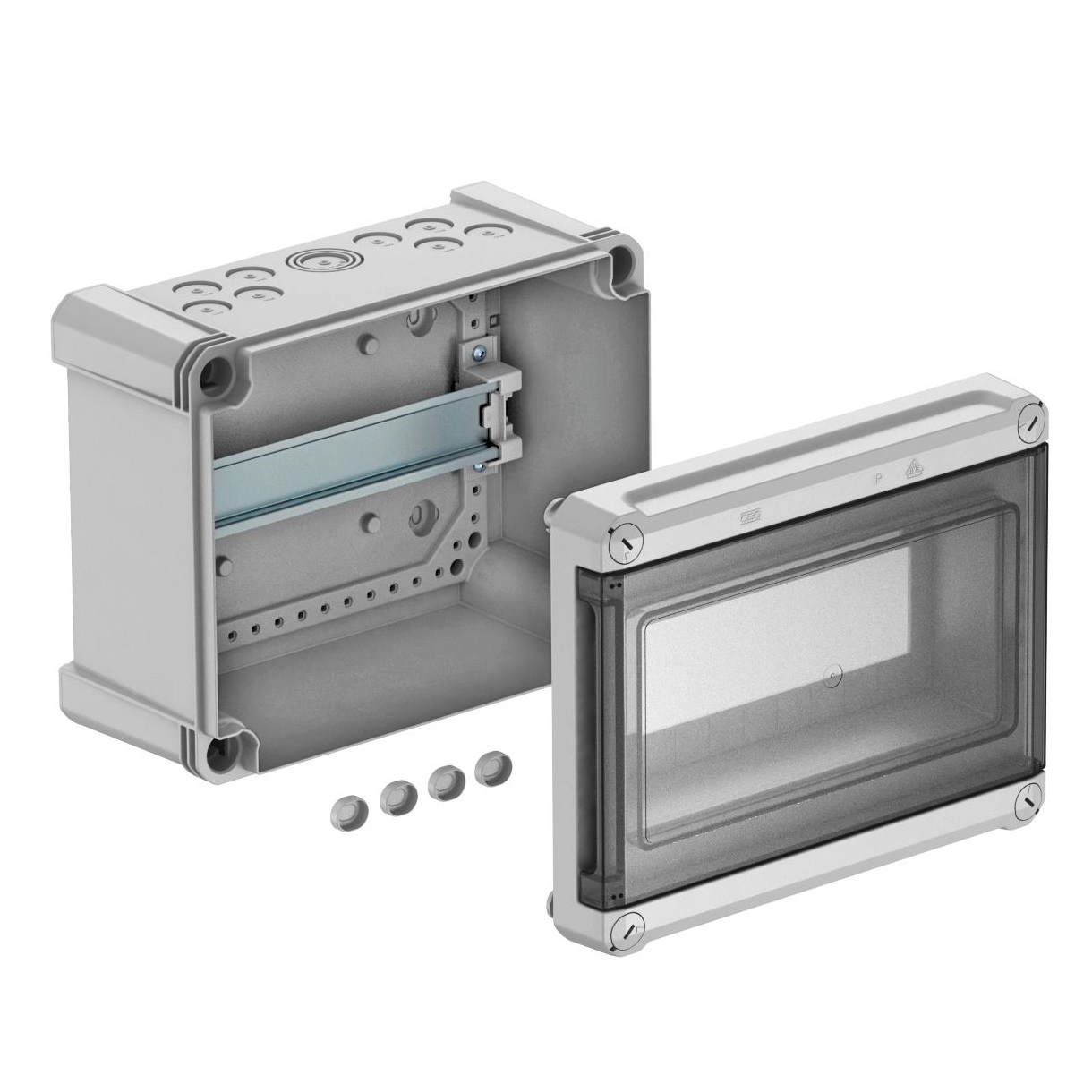Невеликий розподільний щит для поверхневого монтажу, для внутрішнього й захищеного зовнішнього розподілу електроенергії, відповідно до IEC 439-3. З попередньо встановленим 35-міліметровим профілем DIN-шини. Клас захисту IP66 та ступінь захисту IK06. Прозора кришка, з вирізом.