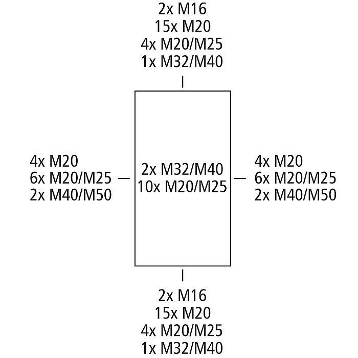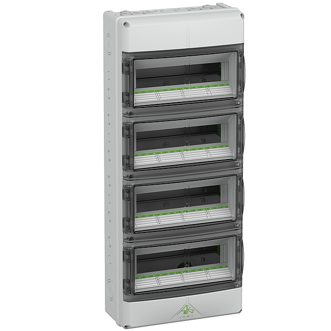 Малий розподільний щит, клас захисту IP65, 4 ряди, 56 доступних модулів, з вбудованими вентиляційними елементами для зменшення утворення конденсату.