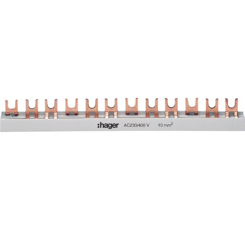 Вилочна з'єднувальна шина Hager призначена для підключення триполюсних автоматичних вимикачів у розподільчому електричному щиті.