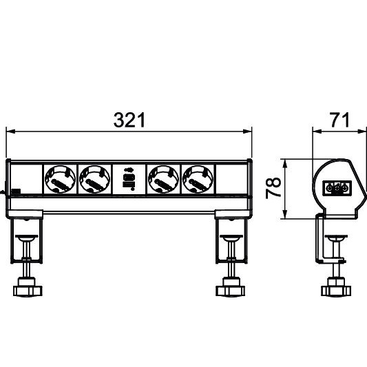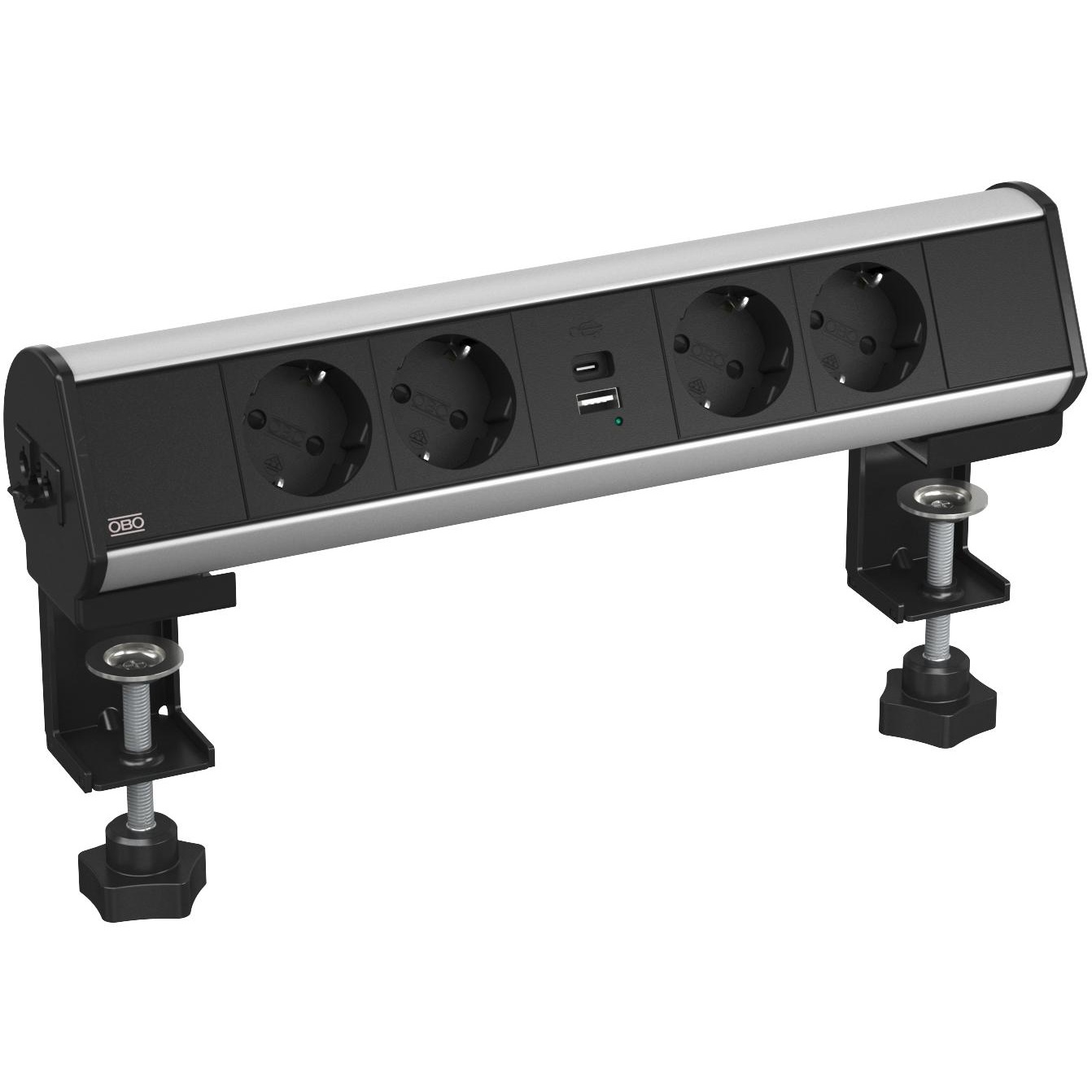 Готовий до підключення Deskbox DBL для прямого живлення робочих станцій. З роз’ємом Wieland GST18® і роз’ємом для кабелю. Монтаж без інструментів за допомогою 2 кріпильних затискачів для стільниці товщиною від 8 до 40 мм і від 40 до 70 мм. Deskbox оснащений 4 чорними захисними контактними розетками під кутом 33° і зарядним пристроєм USB A+C потужністю 18 Вт.