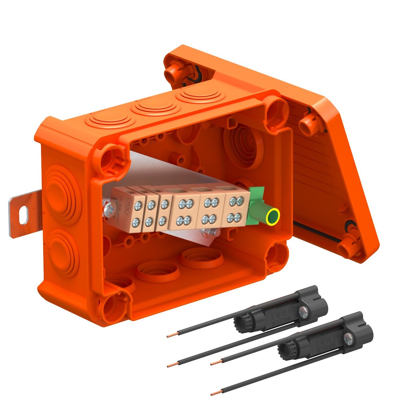 Кабельна коробка розгалуження з двома тримачами запобіжників і м’якими вставними ущільнювачами. Достатньо місця для електричного монтажу завдяки діагональному з’єднувальному блоку з повністю змонтованими термостійкими керамічними клемами. Жовто-зелені клеми заземлення. Кріплення на легко доступних зовнішніх накладках.