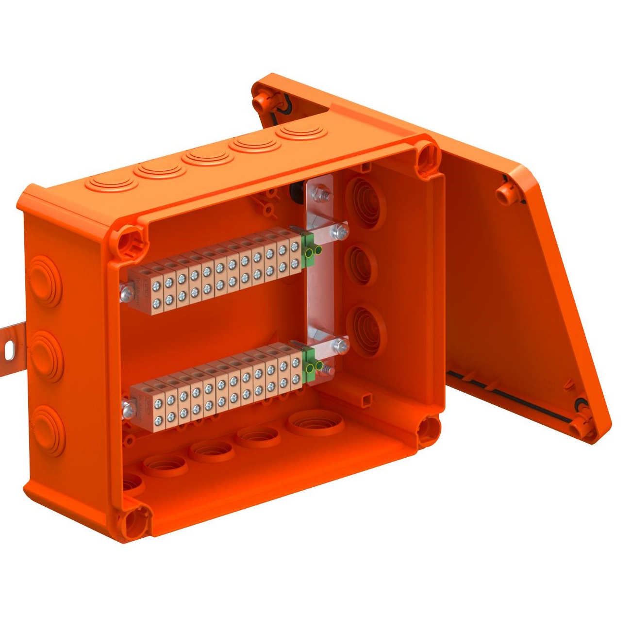 Вогнестійкі коробки FireBox з кабельними вводами для інформаційних технологій Парна кількість термостійких керамічних клем, придатних для інформаційних кабелів. Жовто-зелені клеми захисного провідника/екрановані клеми. Кріплення на легко доступних зовнішніх накладках.