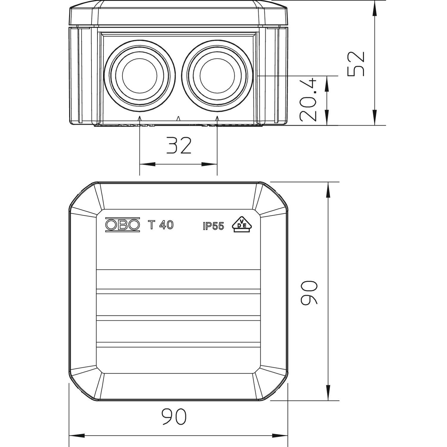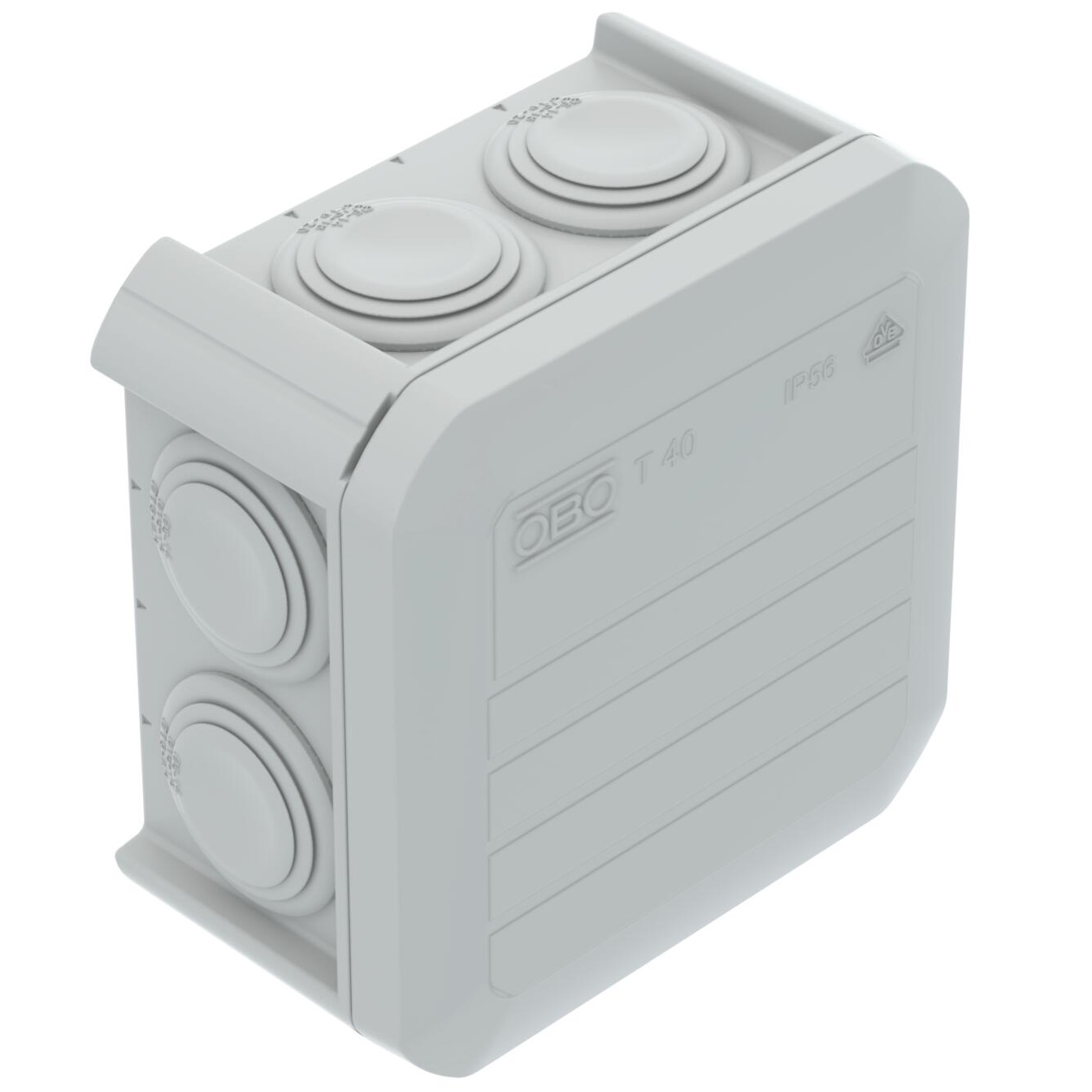 Кабельна коробка розгалуження, для підключення кабелів і провідників у приміщенні або в захищених зонах ззовні приміщень. Квадратна форма зі вставними ущільнювачами на боках та на дні. Підходить для настінного й стельового монтажу та кріплення до монтажної пластини. З можливістю кріплення зсередини. З фіксованою кришкою клемної колодки. Виготовлено з матеріалів без вмісту галогенів та стійких до УФ.