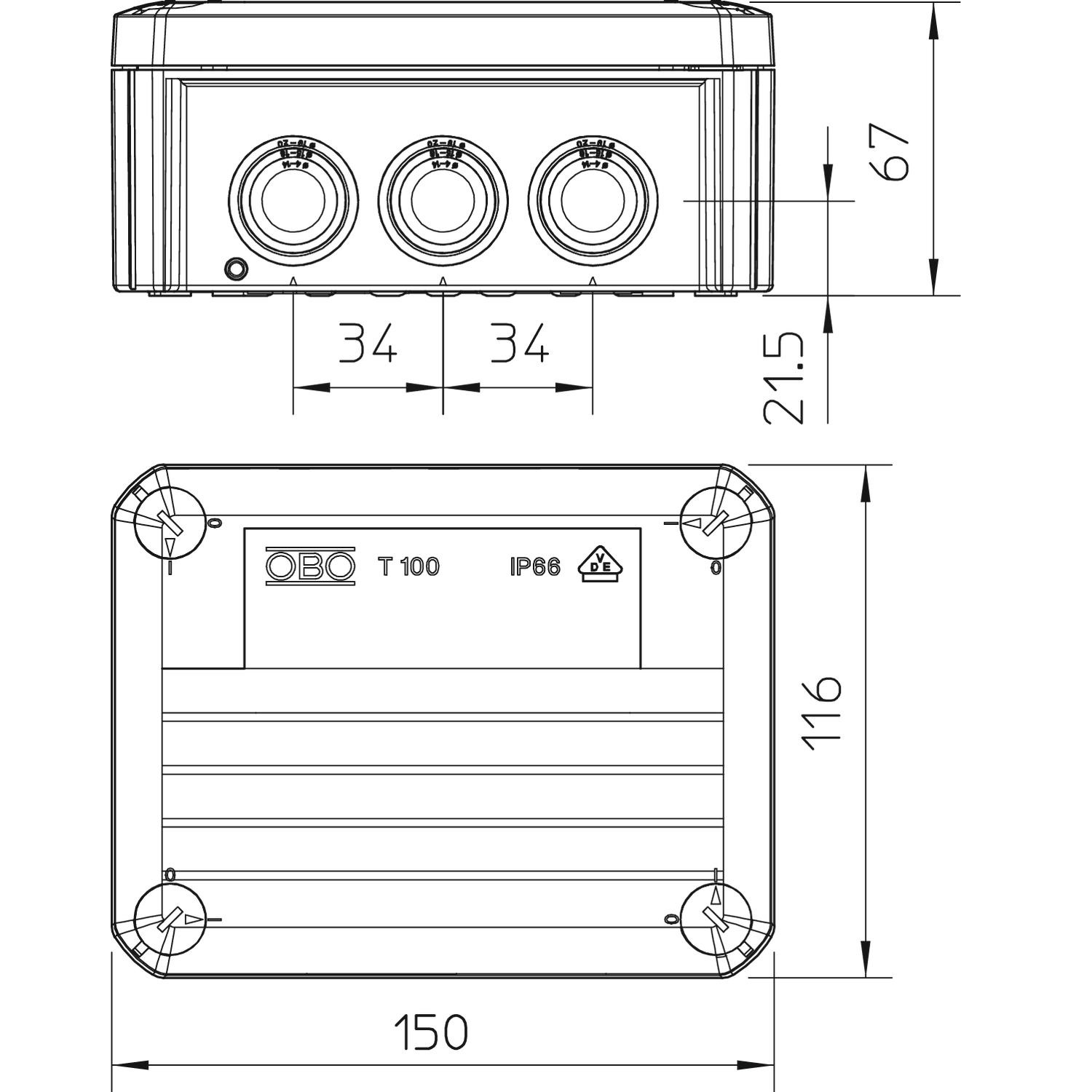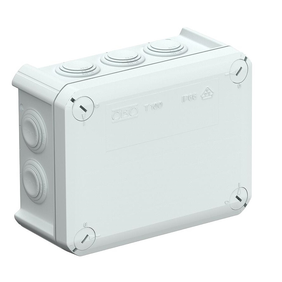 Кабельна коробка розгалуження, для підключення кабелів і провідників у приміщенні або в захищених зонах ззовні приміщень. Прямокутна форма зі вставними ущільнювачами по боках та на дні. Підходить для настінного й стельового монтажу та кріплення до монтажної пластини. З можливістю кріплення зсередини та монтажу через кути. Кришка із поворотним фіксатором, з можливістю пломбування. Виготовлено з матеріалів без вмісту галогенів та стійких до УФ.
