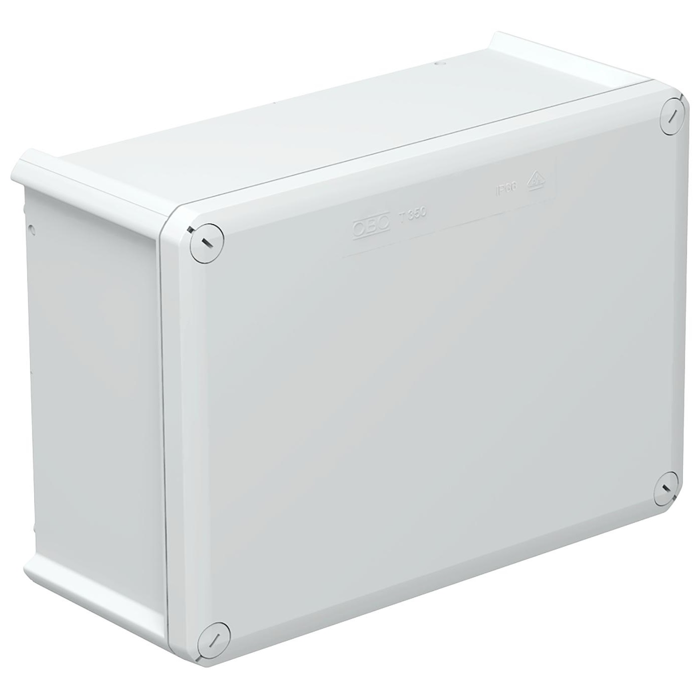 Кабельна коробка розгалуження, з гладкими стінками, для підключення кабелів і провідників у приміщенні або в захищених зонах ззовні приміщень. Прямокутна форма без кабельних вводів. Підходить для настінного й стельового монтажу, кріплення до монтажної плати та пригвинчування до підлоги. З можливістю кріплення зсередини та монтажу через кути. Кришка із поворотним фіксатором, з можливістю пломбування. Виготовлено з матеріалів без вмісту галогенів та стійких до УФ.