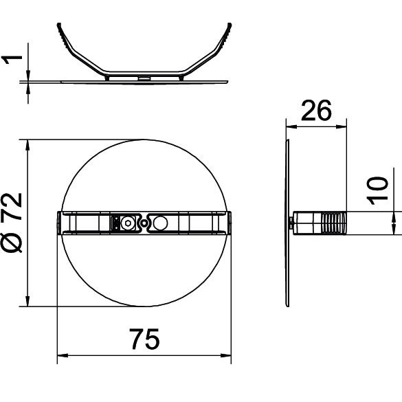 Пружинна кришка з центральною еластичною натискною пружиною, для розеток з Ø 60 мм, край кришки розміщується врівень, поверхня шершава.