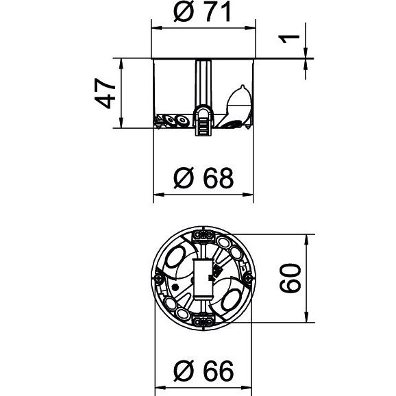 Коробка для порожнистих стін із повітронепроникними мембранними введеннями для використання з монтажною глибиною не менше ніж 47 мм та товщиною панелі 5–40 мм.