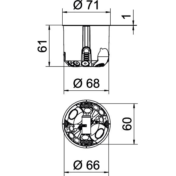 Коробка для порожнистих стін із повітронепроникними мембранними введеннями для використання з монтажною глибиною не менше ніж 61 мм та товщиною панелі 5–40 мм.