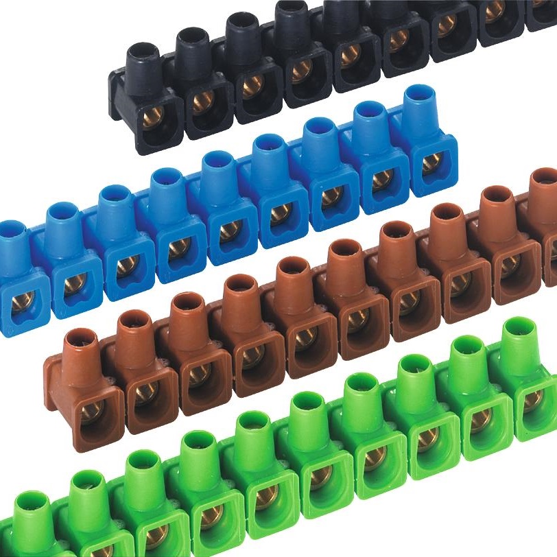 Латунні клеми, сталеві гвинти, гальванічне оцинкування та прозоре пасивування, 12 контактів, клеми від’єднуються по одній, відкриті з обох боків.