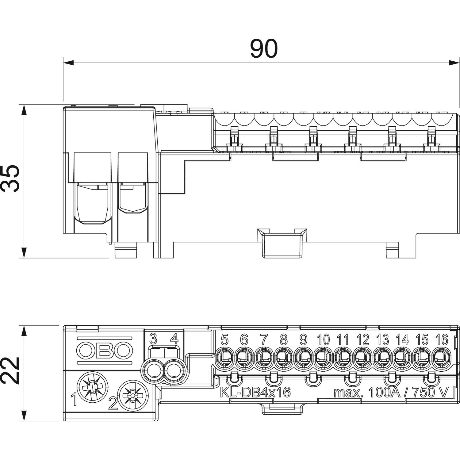 Клема підключення фазового проводу з 12 вставними клемами 2,5 мм²; дві вставні клеми 4 мм² і дві гвинтові клеми 16/25 мм². Для зачеплення на Din рейку 15 мм згідно з DIN EN 50022.