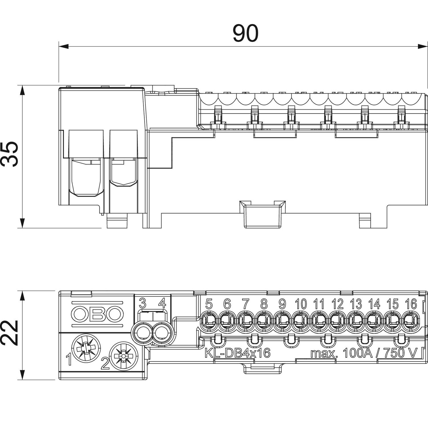 Клема нульового проводу з 12 штекерними клемниками 2,5 мм² або 1,5 мм² з гнучким наконечником; двома штекерними клемниками 4 мм² або 2,5 мм² з гнучким наконечником і двома гвинтовими клемниками до 25 мм² або 16 мм² з гнучким наконечником, 3 Нм. Для закріплення на рейці 15 мм відповідно до DIN EN 60715 (колишній DIN EN 50022).