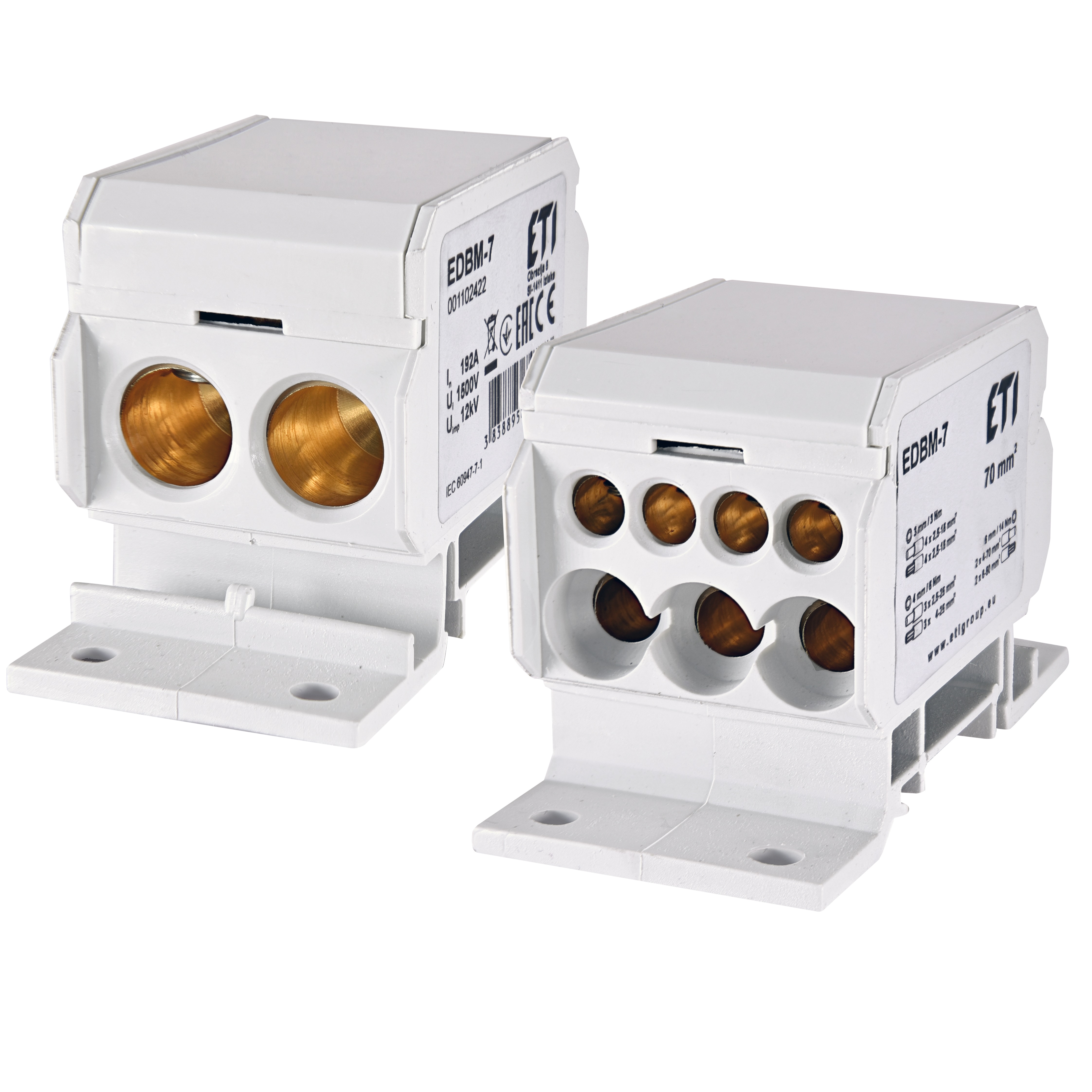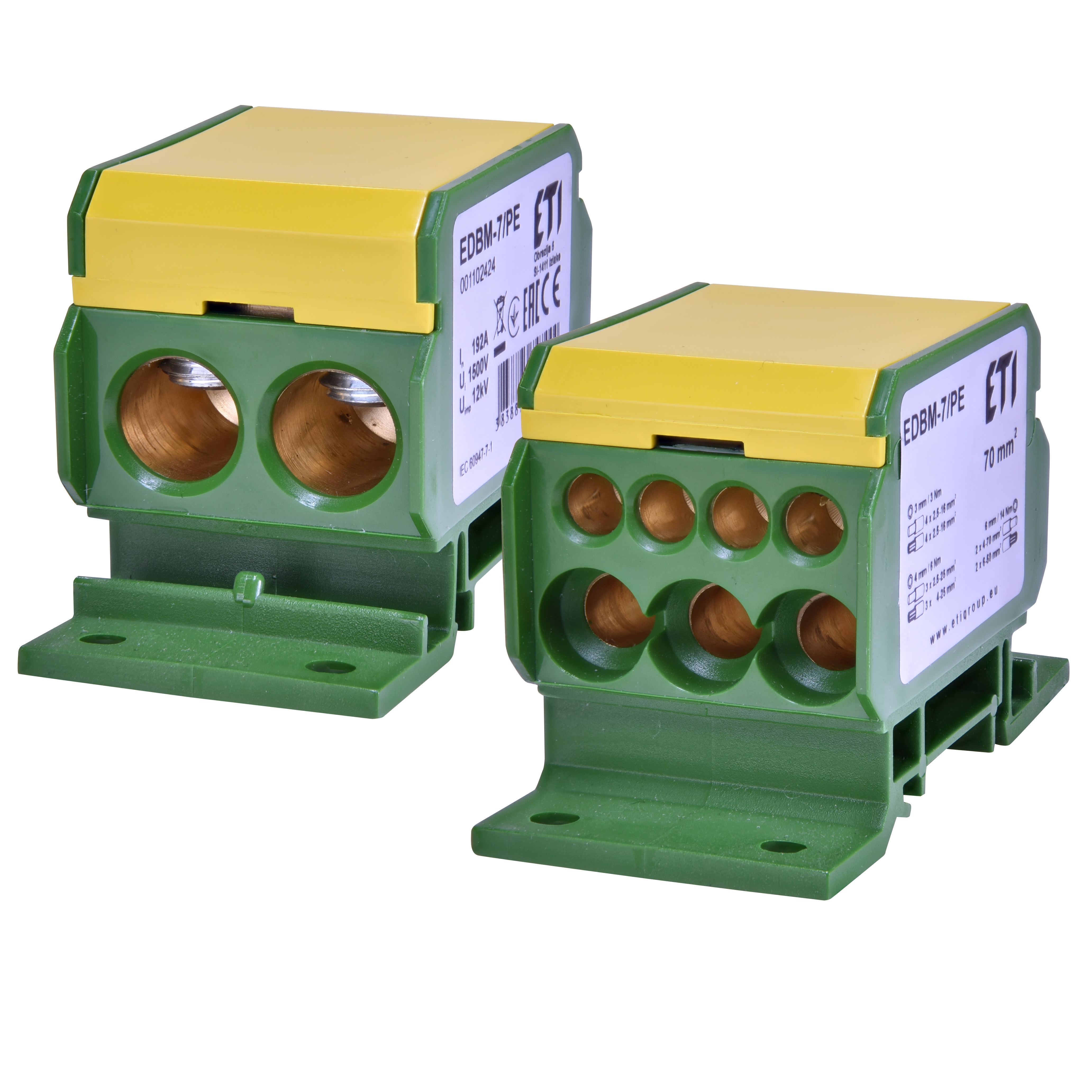 Розподільні блоки серії EDBM призначені для з'єднання провідників більшого перетину з одними або кількома провідниками меншого перетину. Встановлюються в пристроях низької напруги для зручного монтажу, візуального та фізичного розподілу фазних, нейтральних та заземлюючих проводників.