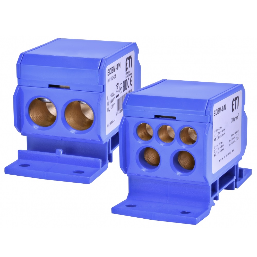 Розподільні блоки серії EDBM призначені для з'єднання провідників більшого перетину з одними або кількома провідниками меншого перетину. Встановлюються в пристроях низької напруги для зручного монтажу, візуального та фізичного розподілу фазних, нейтральних та заземлюючих проводників.