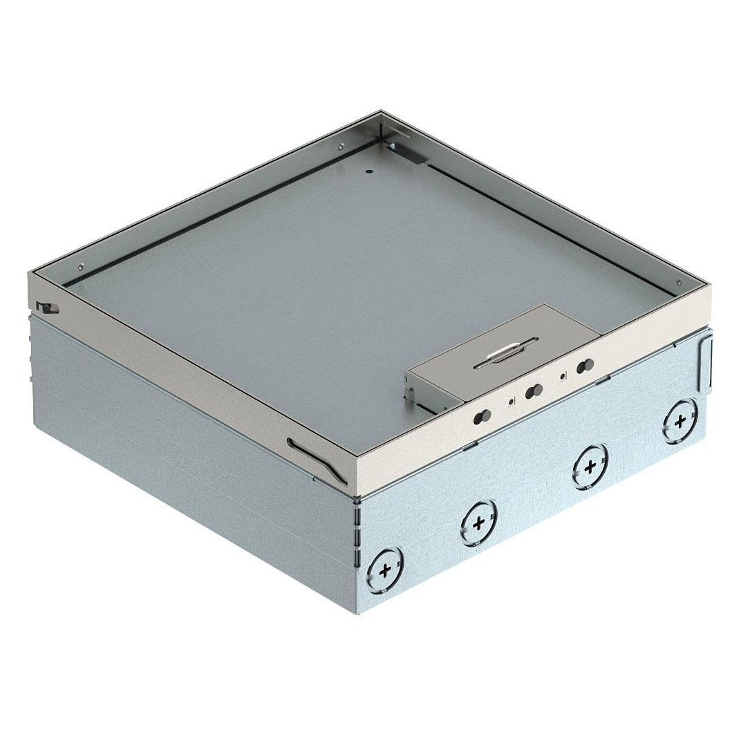 Квадратний лючок для установки в стяжці та в пустотній підлозі із сухим типом прибирання у приміщеннях. Корпус із отворами для введення труб (M25). Верхня частина вирівнюється по поверхні покриття для підлоги за допомогою 4-х регульованих опор. Мінімальна монтажна глибина складає 95 мм, діапазон регулювання за висотою + 30 мм.